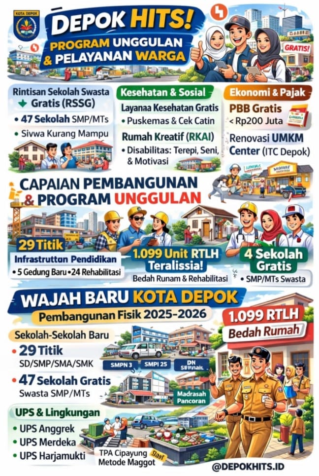 Rangkaian capaian tersebut menjadi gambaran arah pembangunan Kota Depok yang menitikberatkan pada pemerataan infrastruktur, peningkatan kualitas layanan publik, serta penguatan kesejahteraan masyarakat.